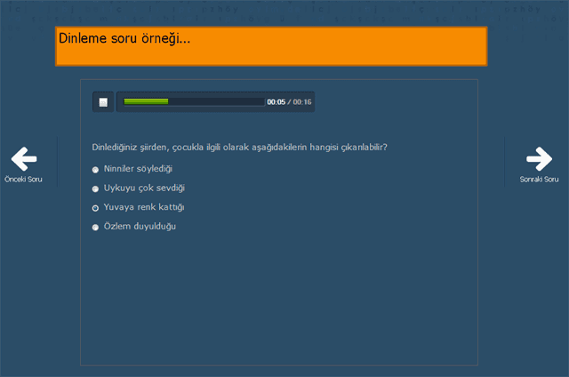 Dinlediğini anlama becerisinin ölçüldüğü çoktan seçmeli sorulardan oluşan bölümdür.